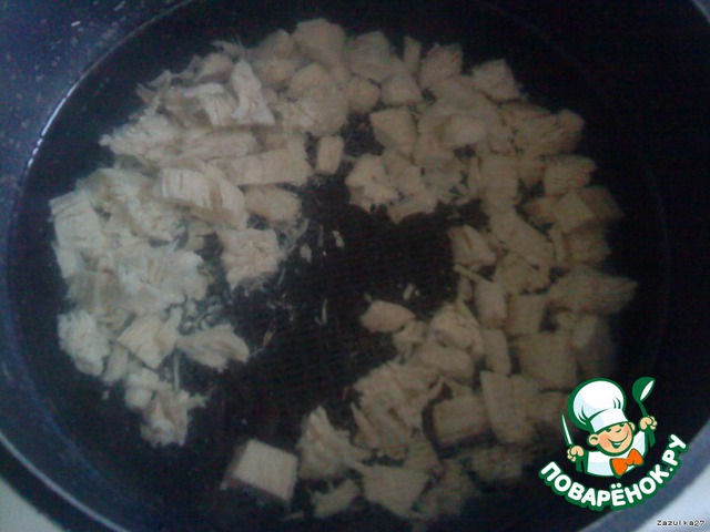 Лучше отварить мясо курицы, но у меня было мало времени. Я взяла два куска индейки (было уже отварено и лежало в морозильнике) приблизительно 100 гр, положить в кастрюлю и отварить. Я варила 5 минут