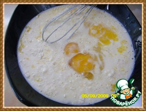 Б) 1 ст молока + 2 яйца + 3 ст л муки перемешать. В смеси могут остаться комки, но не обращайте на них внимания - они разойдутся в конце.