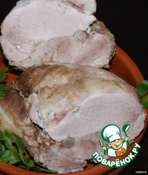 Свинину нужно освободить от жил (Если имеются).Если кусок рваный то лучше собрать и перевязать его(Можно это сделать с помощью бинта-сетки Замочить мясо в холодной воде и оставить на час.Затем заливаем мясо ХОЛОДНОЙ водой.Доводим до кипения ,воду сливаем.Снова заливаем(Вода холодная).Лук режем на 4 части кладем в мясо+лавровый лист+резанную кольцами морковь+петрушку+соль+перец горошком. Доводим до кипения ,притушем огонь и варим 40 минут