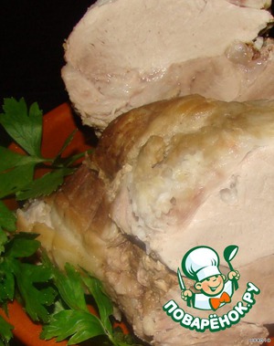 Через 40 минут Мясо немного остудим.Заворачиваем в фольгу(Можно завернуть в слоеное тесто ,тесто смазать желтком )И ставим в разогретую до 200 гр духовку на 30 минут