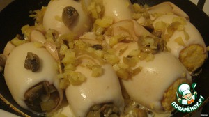 Набитые начинками кальмары складываем в сковородку, если остались начинки, их можно смело смешивать и прям сверху на кальмары выложить.