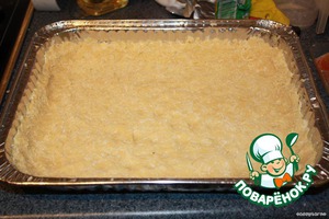 Руками вдавить в небольшой противень (20х30 см) так, чтобы оставались бортики. Лучше всего это сделать, придавив сверху точно таким же противнем. Проколоть вилкой в нескольких местах. Поставить в разогретую до 180 духовку и печь минут 10-15 до золотистого цвета. При выпечке сие творение будет пытаться подниматься, но мы это пресекаем в корне, вернув на него второй противень (с помощью которого мы формировали базу)
