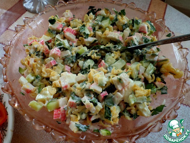 Крабовые палочки порезать, яйца измельчить, мелко порезать зелень и лук.