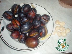 Первым делом готовим сливы. Их помыть и немного надрезать (но не разрезать пополам), чтобы вынуть косточку. Чеснок почистить.