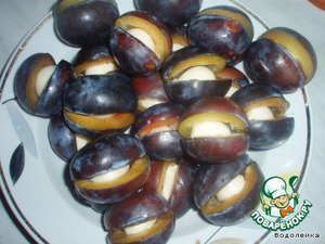 Теперь берем и вкладываем чеснок в сливы. Какое количество чеснока вкладывать в сливы - это дело вкуса. Если зубчики не большие, можно вложить целыми. Я, например, разрезала зубчики чеснока пополам.