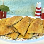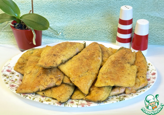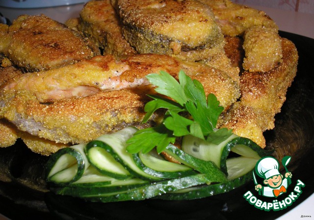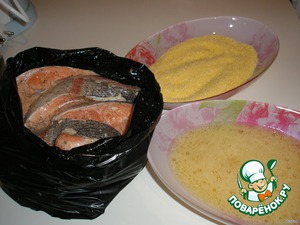 Далее – обмакиваем каждый кусочек во взбитое яйцо (его немного присолить), затем обваливаем в кукурузной муке (в крупе не пробовала).
