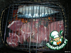 • После того, как мясо и рыба промаринуются, выложить их на решетку и жарить до готовности на мангале