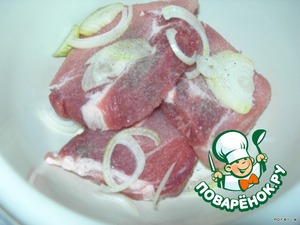 • Мясо полить лимон. соком, посолить, поперчить и посыпать луком. Оставить мариноваться на 30 минут, прикрыв посуду крышкой