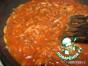 Томатную пасту разводим водой и добавляем к грибам и луку.