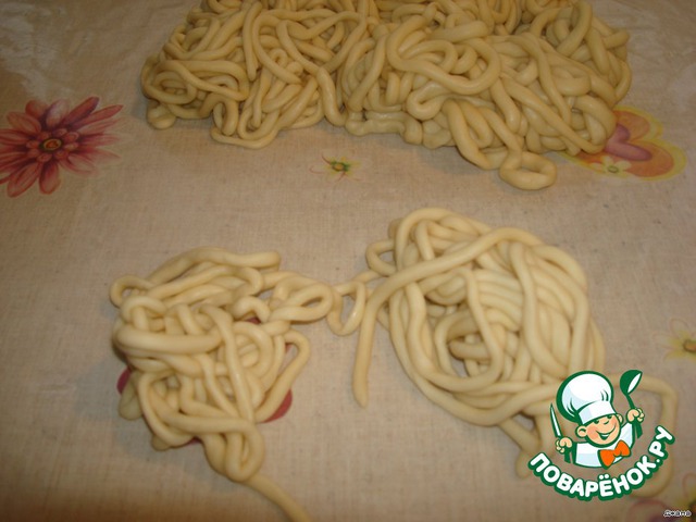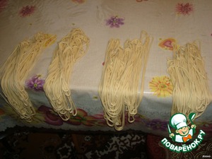 Постепенно, каждую лапшинку, по очереди, раскатываем и вытягиваем одновременно на столе.