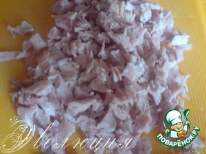 Вареное куриное мясо нарезаем кубиками. Добавляем чуть майонеза, перемешиваем.