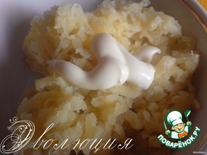 Вареный картофель натираем на крупной терке. Смешиваем с малым количеством майонеза.