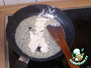 Лук обжариваем на растительном масле до прозрачности, добавляем муку и обжариваем до золотистого цвета.