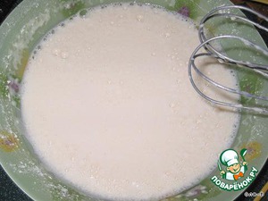 В глубокой миске смешать молоко, яйца, ванильный сахар, соду, муку, растительное масло, 3 ст.л. сахара, соль и взбить все миксером, чтобы не было комочков,