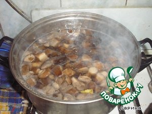 Грибы почистить, промыть, произвольно нарезать и отварить в подсоленной воде до готовности (при варке можно добавить лавровый листочек)
