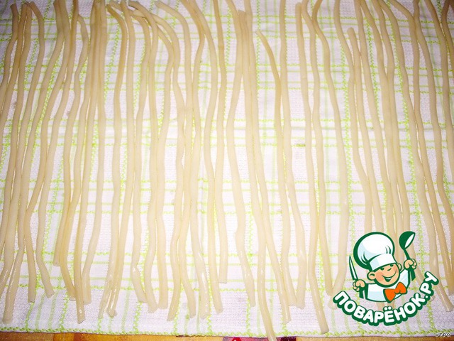 Отварить макароны. Слить воду, промыть и выложить их на полотенце, чтоб подсохли и приобрели липкость.