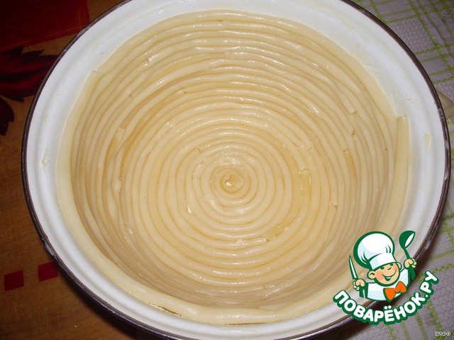 Форму обильно смазываем сливочным маслом. И с серединки начинаем на дно выкладывать макароны спиралькой. И так, пока не выложим борта. -