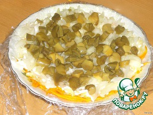 Следующий слой - маринованный лук. Его надо немного отжать перед тем, как укладывать на картофель.
