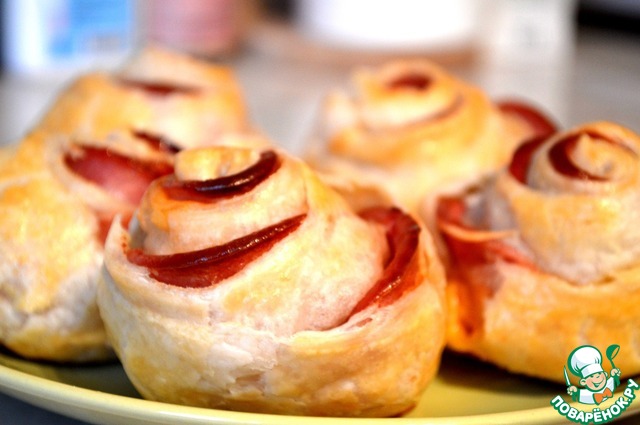 Колбасу нарезала тонко и разделила на половинки. На каждый "прямоугольник" из теста положила две половинки колбасы, с небольшим нахлестом. -