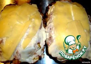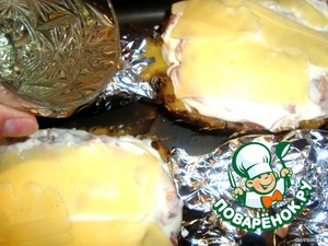 Смазать соусом, выложить сверху сыр, нарезанный тонкими пластинами.