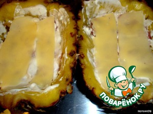 На сыр выложить ананас, также нарезанный тонкими пластинами. Из всей мякоти ананаса нам понадобится только 1/4 часть.