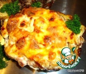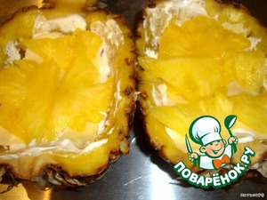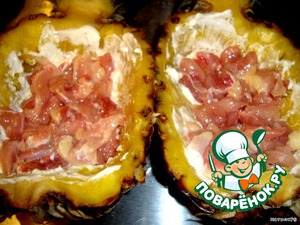 Смазать ананасовые лодочки чесноком и уложить первым слоем нарезанное мелкими кусочками филе.