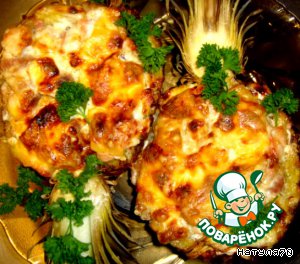 Хвостики ананаса заворачиваем в фольгу, укладываем в противень, выливаем в противень вино, разбавленное с водой - 1:1, и отправляем в духовку на 1,5 часа при температуре 180 гр.