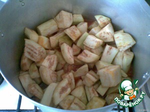 Положить в соус порезанные баклажаны и накрыть крышкой. Кипятить на маленьком огне 7-10 минут. Иногда нужно мешать, чтобы не пригорели. В общем, баклажаны довести до полуготовности.