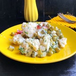 Смешать все ингредиенты, добавить зеленый горошек и заправить йогуртом.