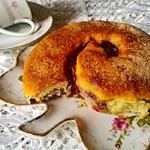 Сверху смазываем пирог молоком, посыпаем смесью корицы, сахара и ванилина. И я еще украсила кандисом.