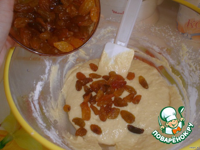 Потом добавляем изюм и хорошо перемешаем лопаткой. |