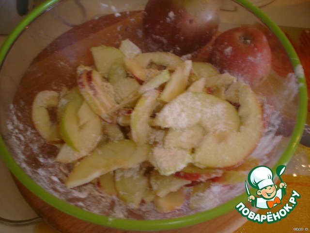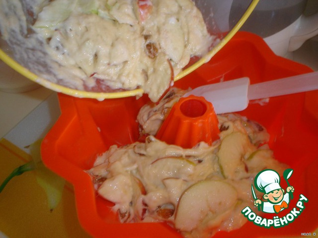 В наше подошедшее тесто добавим яблоки, перемешаем. Потом очень осторожно добавляем взбитые белки (порциями и перемешивая) |