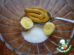 Когда рыба готова к употреблению, делаем соус. Для этого вареные желтки хорошо перетираем с сахаром и горчицей (у меня сначала был 1 желток, но потом поняла, что стоит добавить еще один).