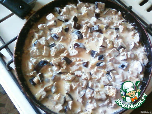 3. Добавить баклажаны с яйцами и очень быстро премешивать (яичница нам здесь ни к чему). На это уйдет, по моим подсчетам, минут 10