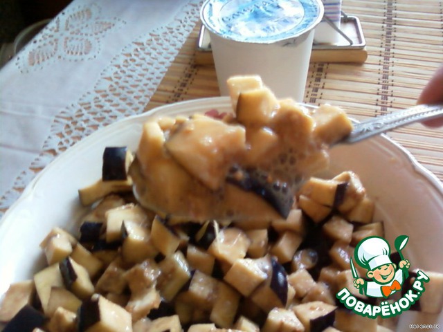 1. Взбить яйца с солью и перцем, добавить туда баклажаны с кожицей, нарезанные кубиками (размером с небольшие грибочки). Замочить в яичной смеси на 15 минут.