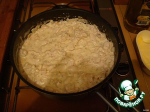 Посыпать мукой, влить сливки и коньяк, добавить специи, слегка потушить до загустения;