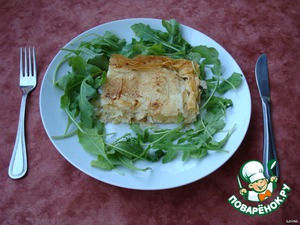 Если после выпекания вам пирог покажется слишком хрустящим, то можно по уголкам в листик налить немного воды и оставить пирог, накрытый полотенцем, отдохнуть.