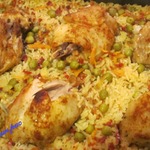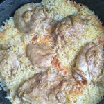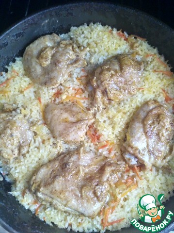 Куриные четвертинки посолить, поперчить, паприка сладкая, специи для курицы (у нас называется - "гриль оф" ). Выложить поверх риса, прямо на воду. Закрыть алюминиевой бумагой и в духовку.