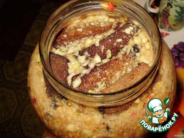 Яблочную массу выкладываем в посуду (не алюминиевую)-можно в кастрюлю или 5 литровую банку. В теплой кипяченой воде разводим дрожжи, сахар, мед и заливаем яблоки, если используем дрожжи, то их тоже разводим, если сухарики - просто кладем сверху.