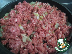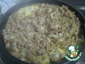 Добавляем мясной фарш и обжариваем, периодически помешивая, пока мясо не посветлеет.