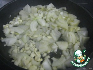 В хорошо разогретой сковороде с добавлением растительного масла, обжариваем очищенные и измельченные лук и чеснок (около 5 мин.).