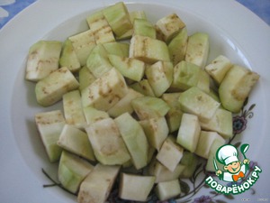 Баклажаны нарезаем квадратиками, посолим и отставим, что бы ушла горечь.