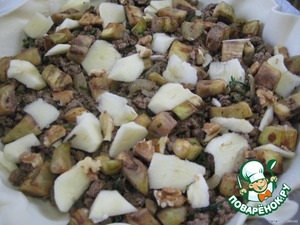 Выкладываем на тесто мясной фарш, баклажаны, кусочки очищенного яблока (по желанию), -