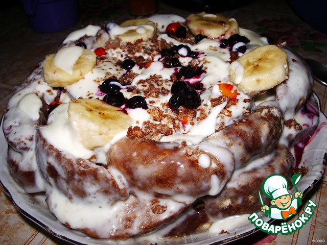 Сделать еще один или два слоя. Вместо бананов можно использовать другие фрукты или ягоды. Украсить шоколадной посыпкой, ягодами или фруктами.