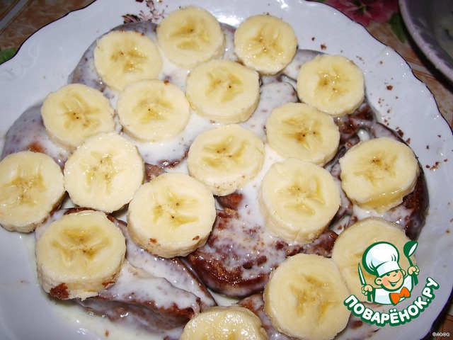Бананы нарезать тонкими ломтиками, укладывать их на слой пряников.