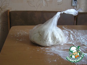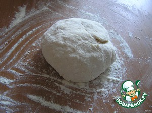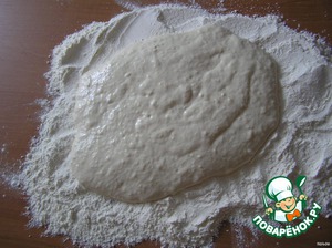 На стол насыпаем муку, выливаем тесто и вымешиваем его так, чтобы отставало от рук.