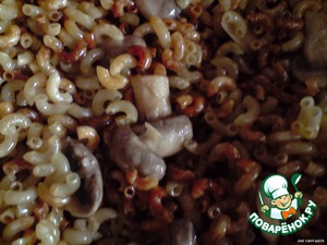 Макароны (желательно мелкие, чтобы лучше обжарились) высыпаем на разогретую сковороду (с растительным маслом), с грибами одновременно (грибы нарезаем крупными кусками) и жарим (при этом постоянно помешивая)