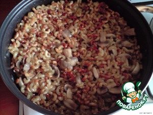 Когда макароны и грибы приобрели коричневатый оттенок, заливаем кипятком (так, чтобы макароны покрылись на палец)