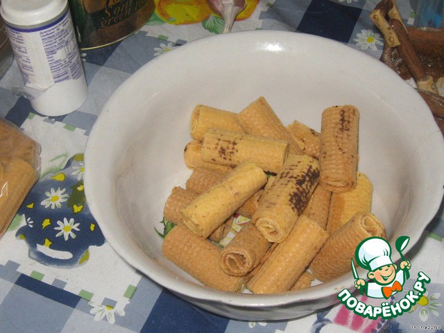 Вафли тоже покрошить (можно и без них). У меня были вафельные трубочки без добавок.