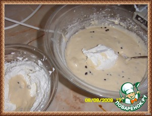 Взбить добела. Продолжая взбивать на медленной скорости, всыпать по ложке просеянную с разрыхлителем муку, ванилин,